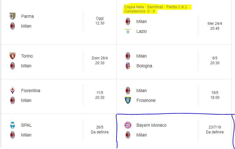 Questa quindi è la classifica attualmente. Se vedete che ci sono evidenziate Milan e Parma è perchè oggi alle 12:30 giocheranno. Innanzitutto volevo sottolineare il fatto che c'è una sorta di spaccatura nella Serie A. La prima è quella di Juve e Napoli con le altre, poi c'è Inter che è in uno stato di quiescenza e poi ci sono Milan, Roma, Atalanta, Lazio, Torino e Sampdoria che lottano tutte per la Champion, ovviamente chi più chi meno. Dopodiché troviamo una distanza di ben otto punti che apre una fascia dalla decima posizione alla diciassettesima. Successivamente troviamo Empoli, Frosinone e Chievo che purtroppo l'anno prossimo abbandonerà la Serie A e andrà in Serie B. Ora però mi volevo focalizzare su Milan e Roma, le due squadre che non si danno pace. Qui sotto vi mostro le loro prossime partite: